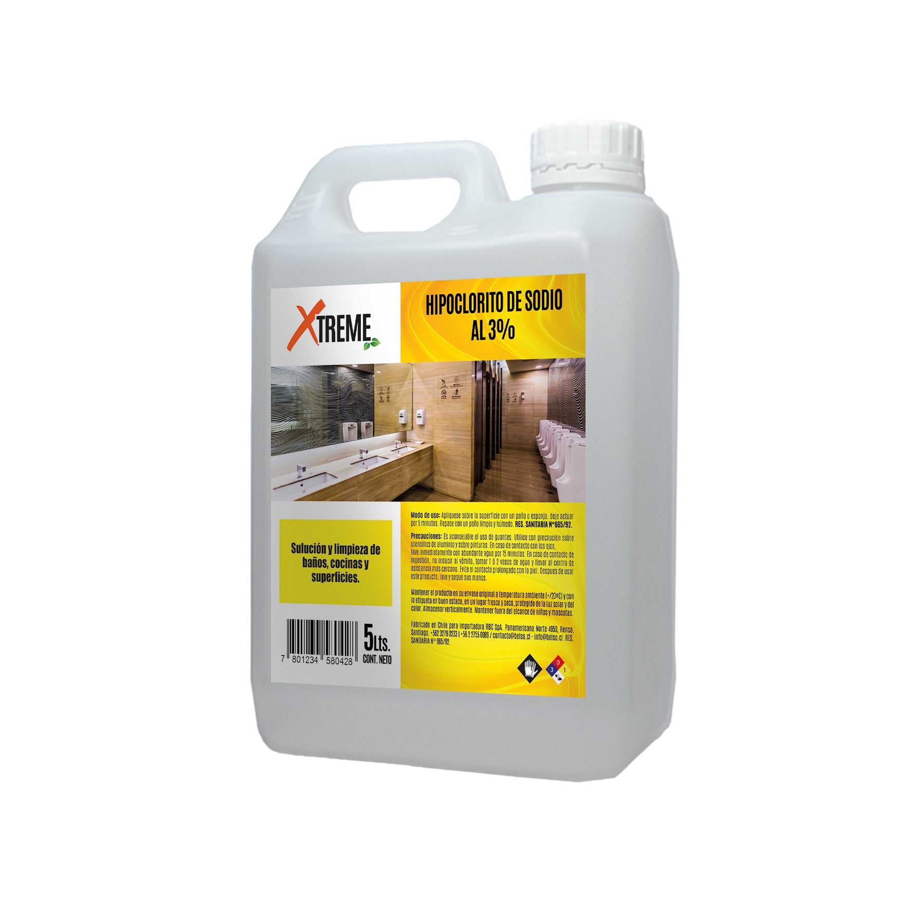 El Hipoclorito de sodio al 3% XTREME 5 Litros (4 unidades) proporciona una desinfección segura y eficaz. Con concentración al 3%, elimina virus, bacterias y hongos en pisos, paredes y cocinas.